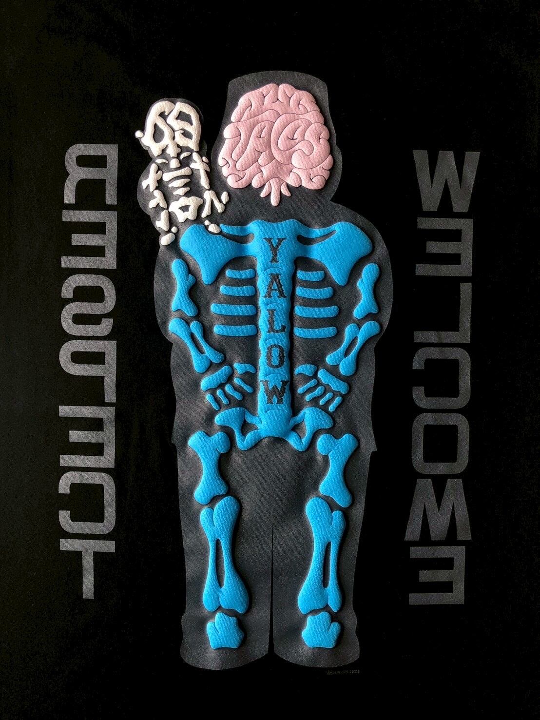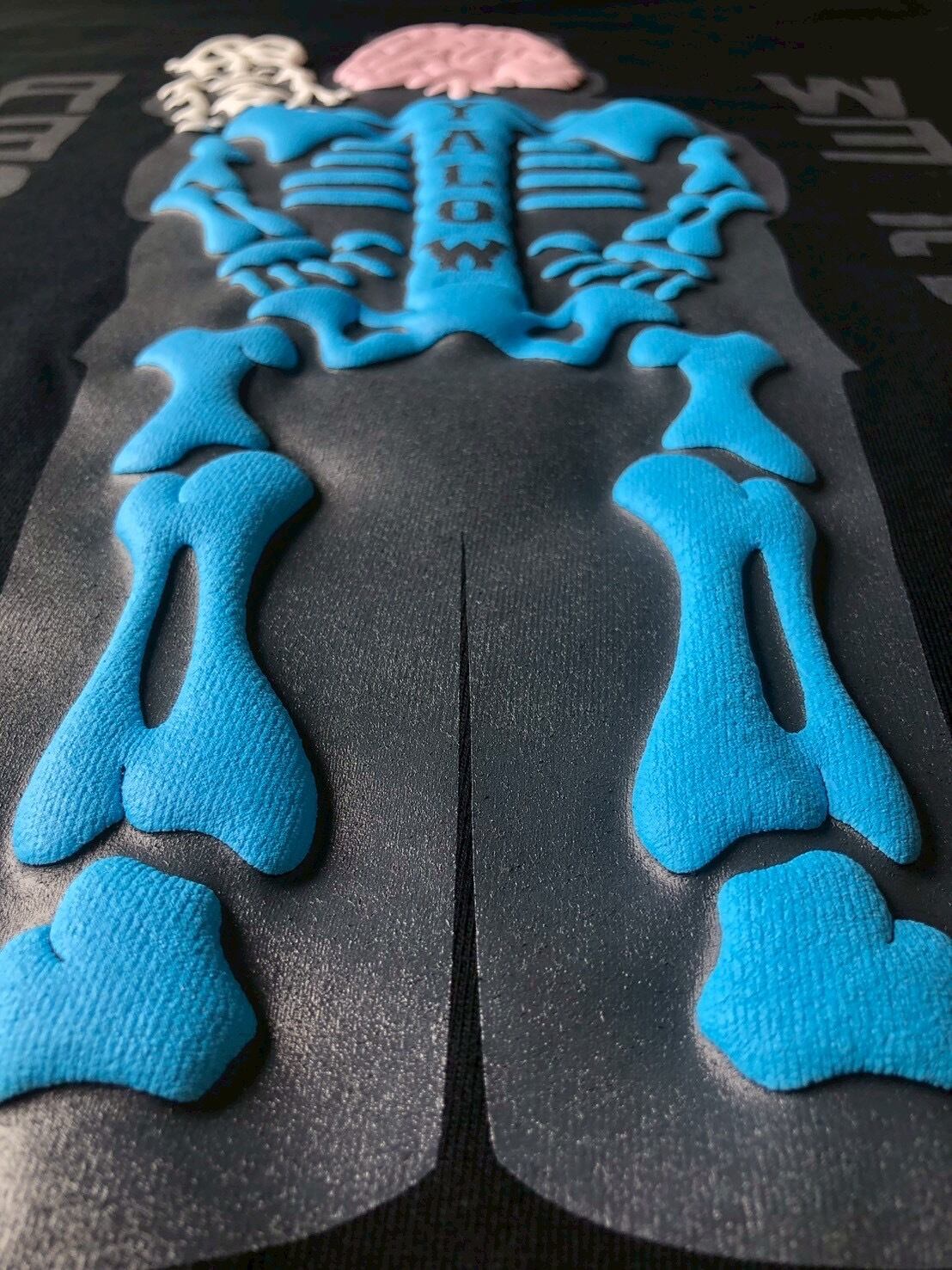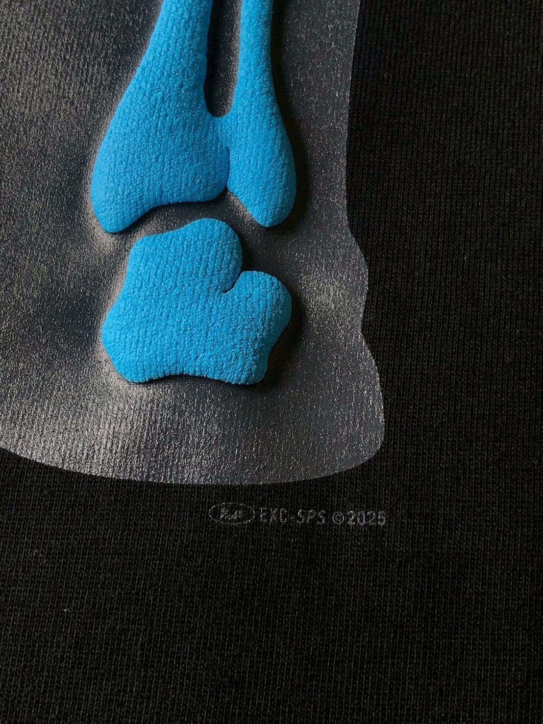 肩に鎮座するライカ兄者スタイルなEXC君。バックプリントにはTシャツカラーごとにナーリーボーイver.とボーンver.をご用意しました。